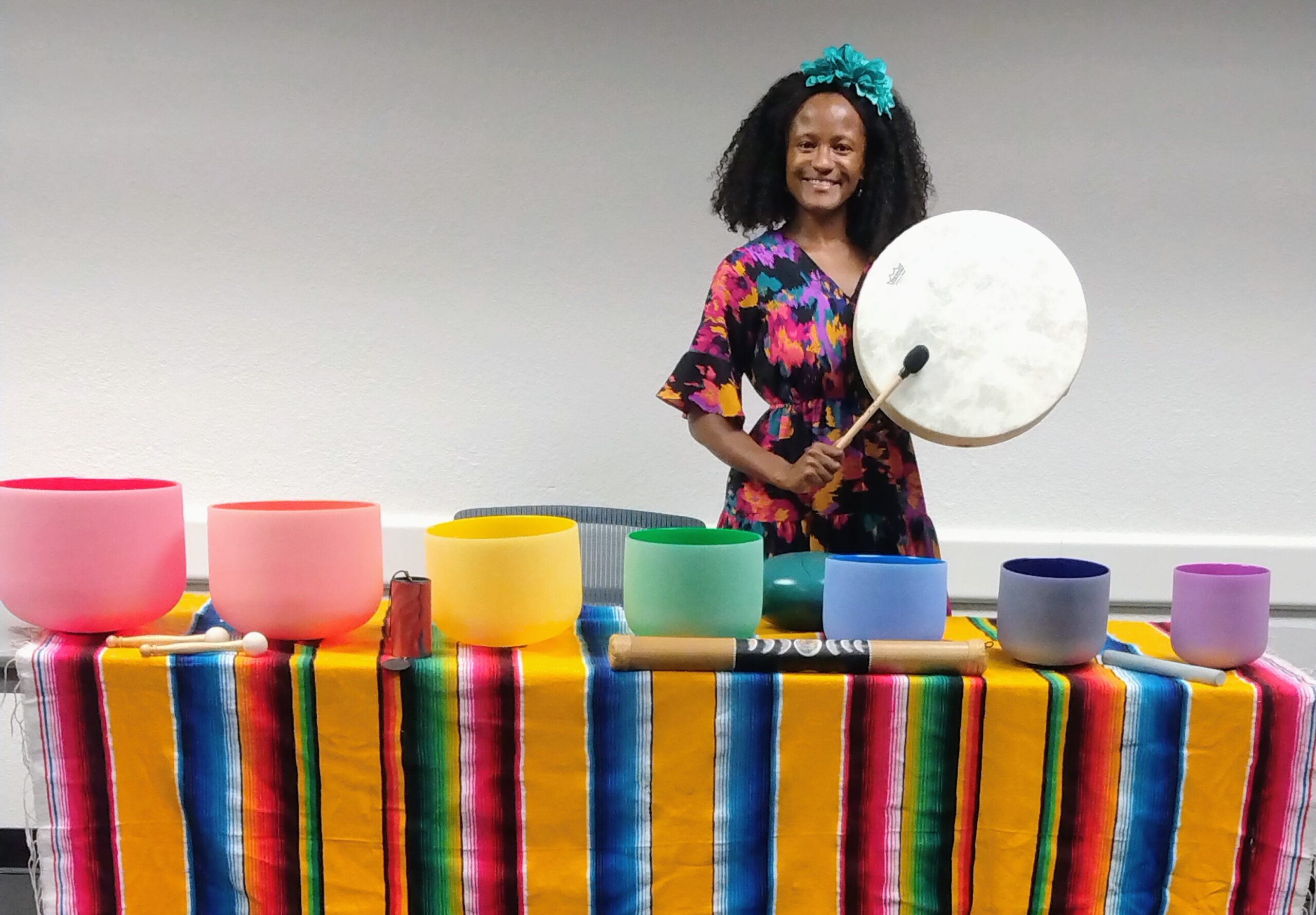 Jeanette Bosak facilitates meditation sessions through guided mindfulness techniques and sound instruments to help individuals develop self-awareness and promote emotional health. (Instruments include: Gong, Crystal Singing Bowls, Ocean Drum, Bronze Singing Bowls and Zaphir Chimes)